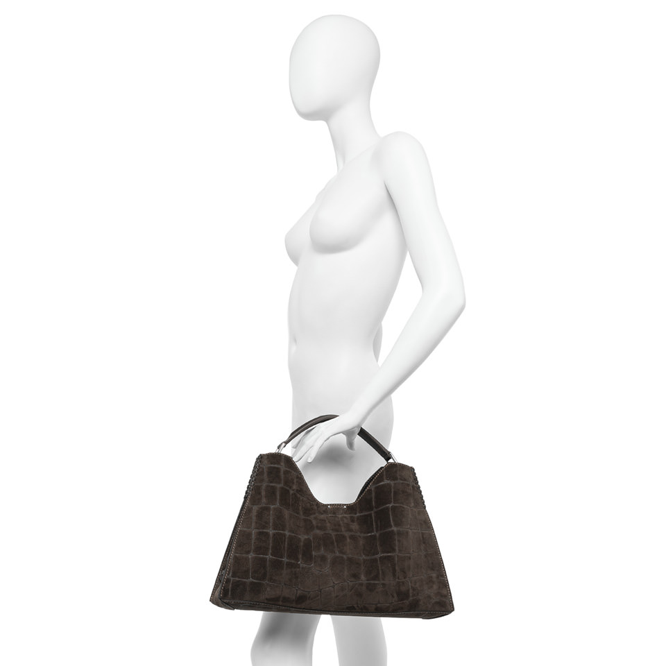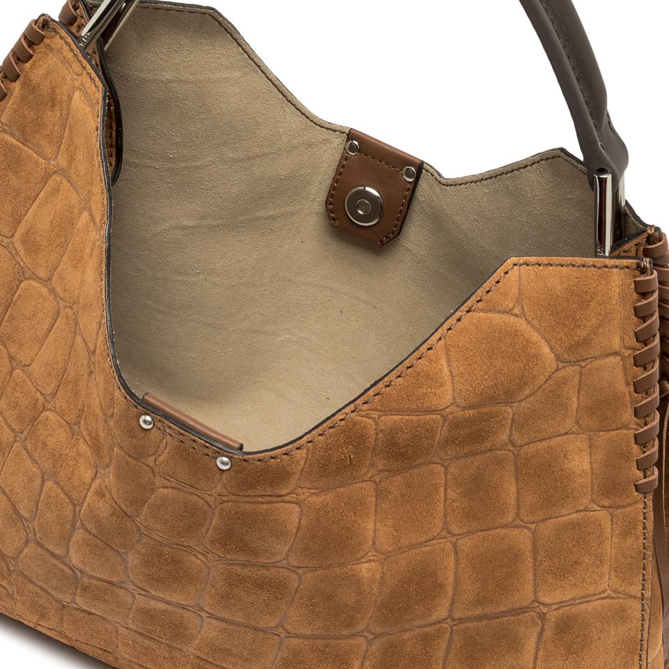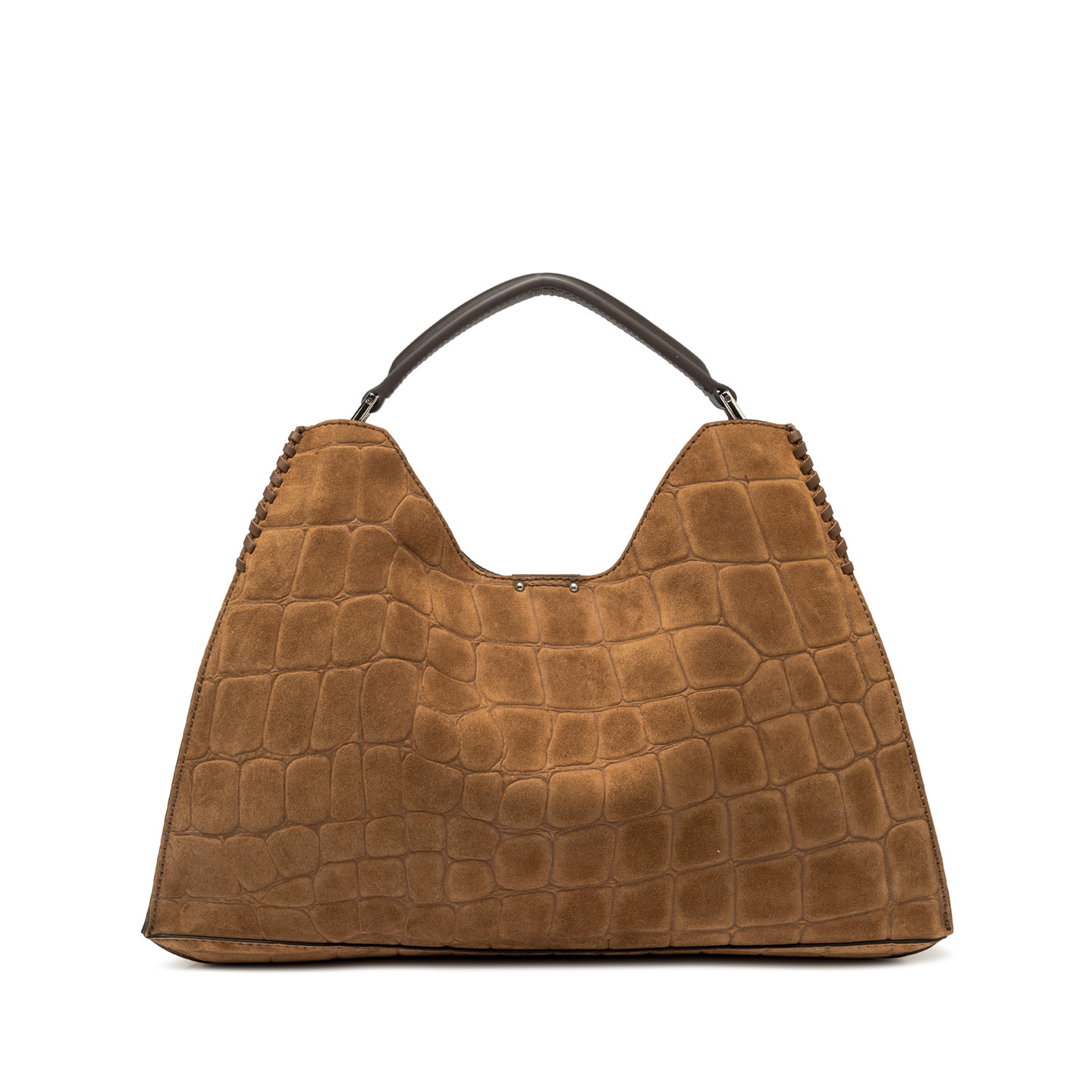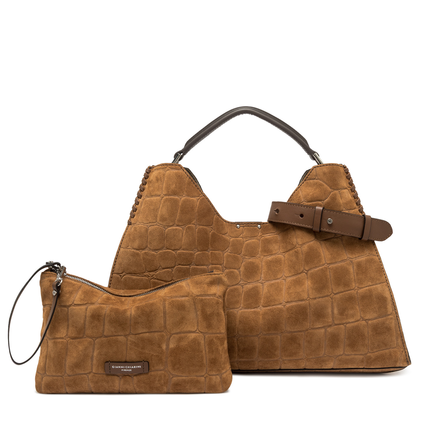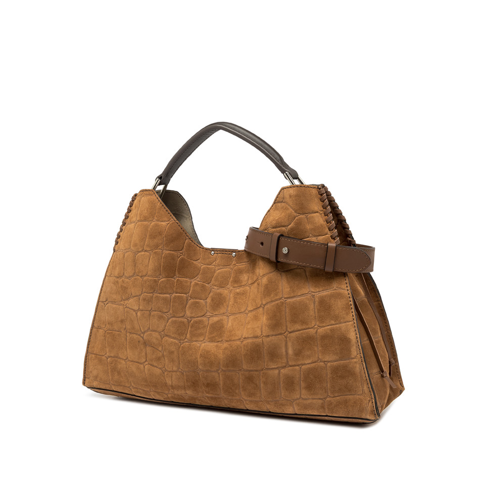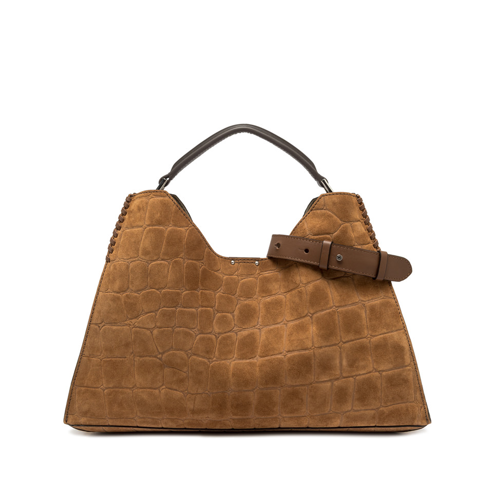 Aurora by Gianni Chiarini Firenze si caratterizzata per una forma trapezoidale. Sinonimo di eleganza contemporanea, è realizzata in pelle scamosciata in maxi stampa cocco ed arricchita da dettagli in metallo. Dotata di una pratica tracolla regolabile e removibile, per una doppia portabilità. Presenta inoltre una chiusura superiore con magnete. Dimensioni: 42x30x10 cm.