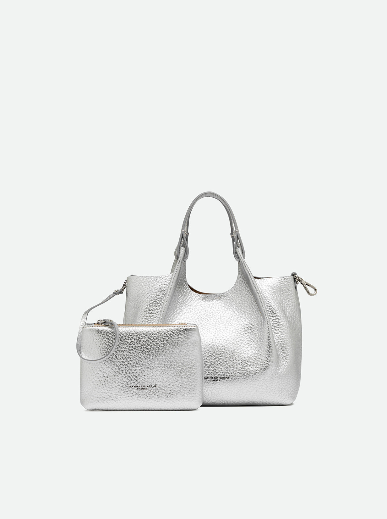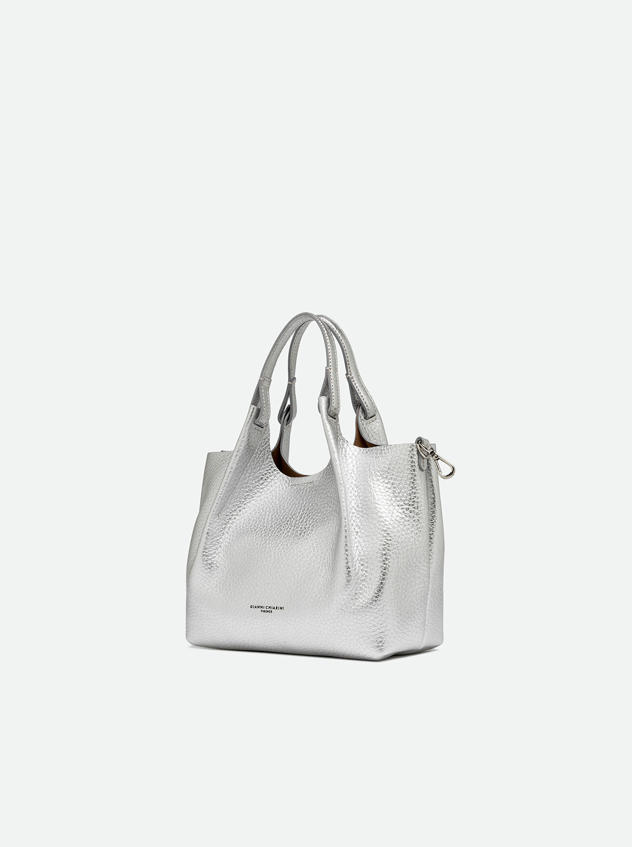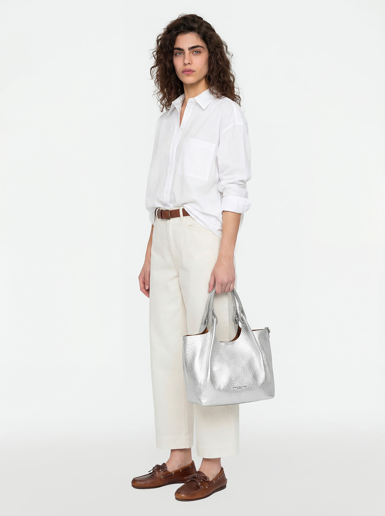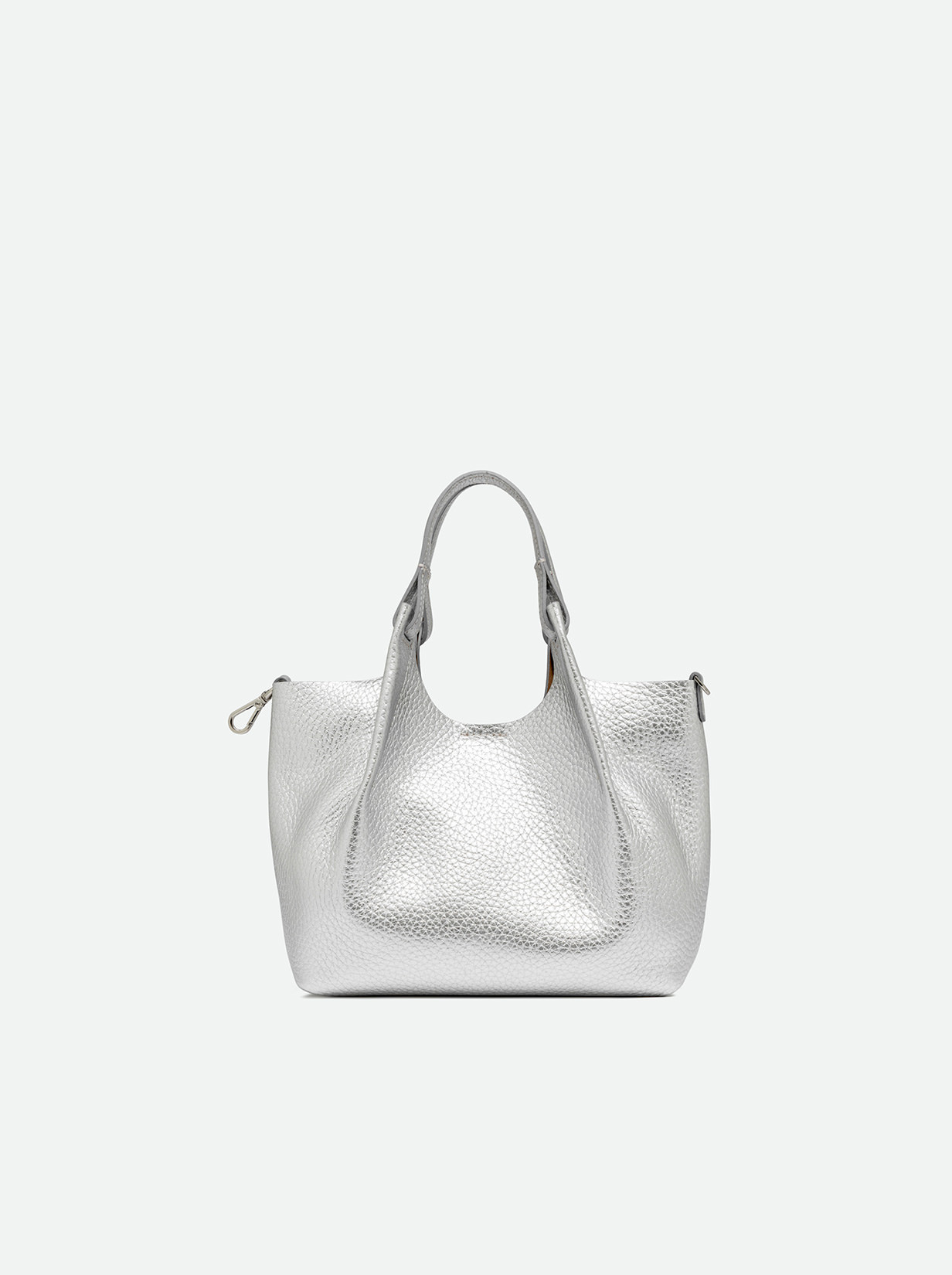 L'icona del brand, la borsa DUA, è realizzata in pelle dalla grana maxi, caratterizzata da una texture unica e distintiva. Dotata di un monoscomparto, presenta profili superiori in pelle e doppi manici in tono. Pratica ed essenziale, è perfetta per completare ogni look con stile. Dotata di una pratica pochette con chiusura a zip. Dimensioni: 24x27x12 cm.