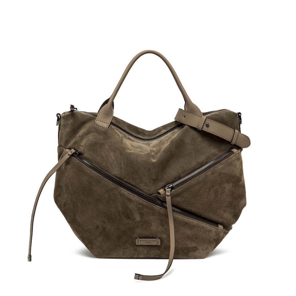 La borsa Shania by Gianni Chiarini Firenze, audace e raffinata, è realizzata in pelle scamosciata e presenta tasche con tagli asimmetrici che ne delineano la silhouette. La chiusura superiore con zip aggiunge un tocco contemporaneo, mentre le pratiche tasche piatte sul fronte offrono funzionalità. Offre una portabilità a mano & crossbody. Dimensioni: 46x34x16 cm.