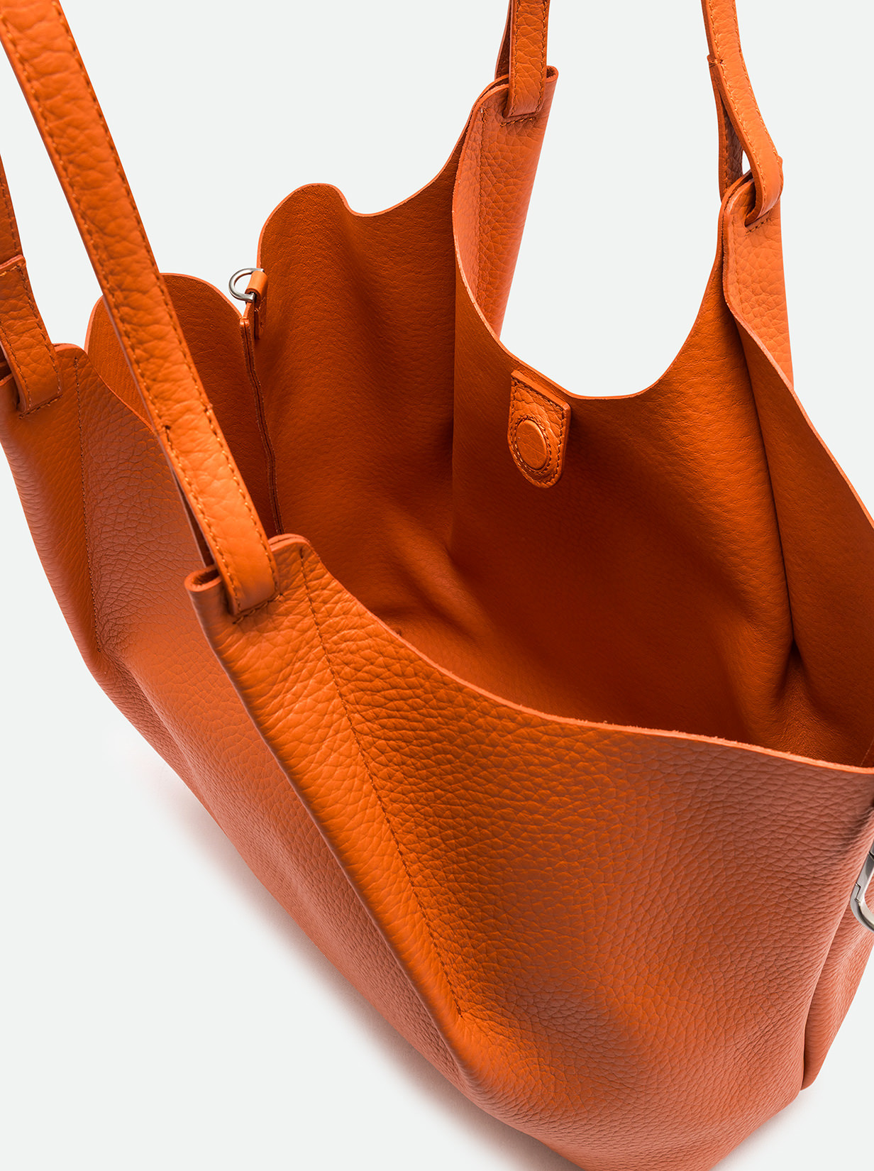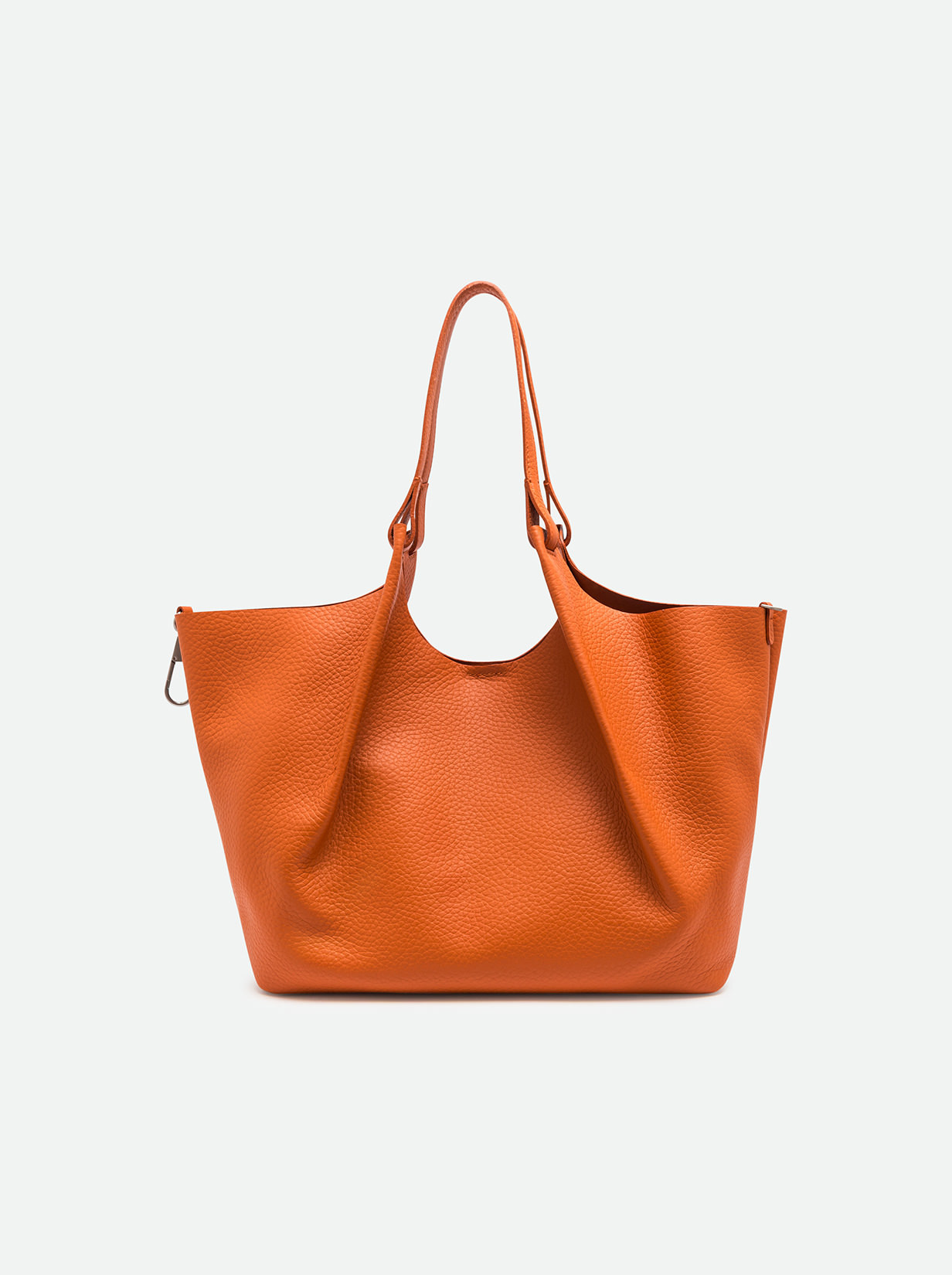 L'icona del brand, la borsa DUA, è realizzata in pelle bubble double, caratterizzata da una texture unica. Dotata di un monoscomparto sfoderato, presenta profili superiori in pelle martellata e doppi manici in tono. Pratica ed essenziale, è perfetta per completare ogni look con stile. Può essere portata a mano o a spalla. Dimensioni: 34x38x16 cm.