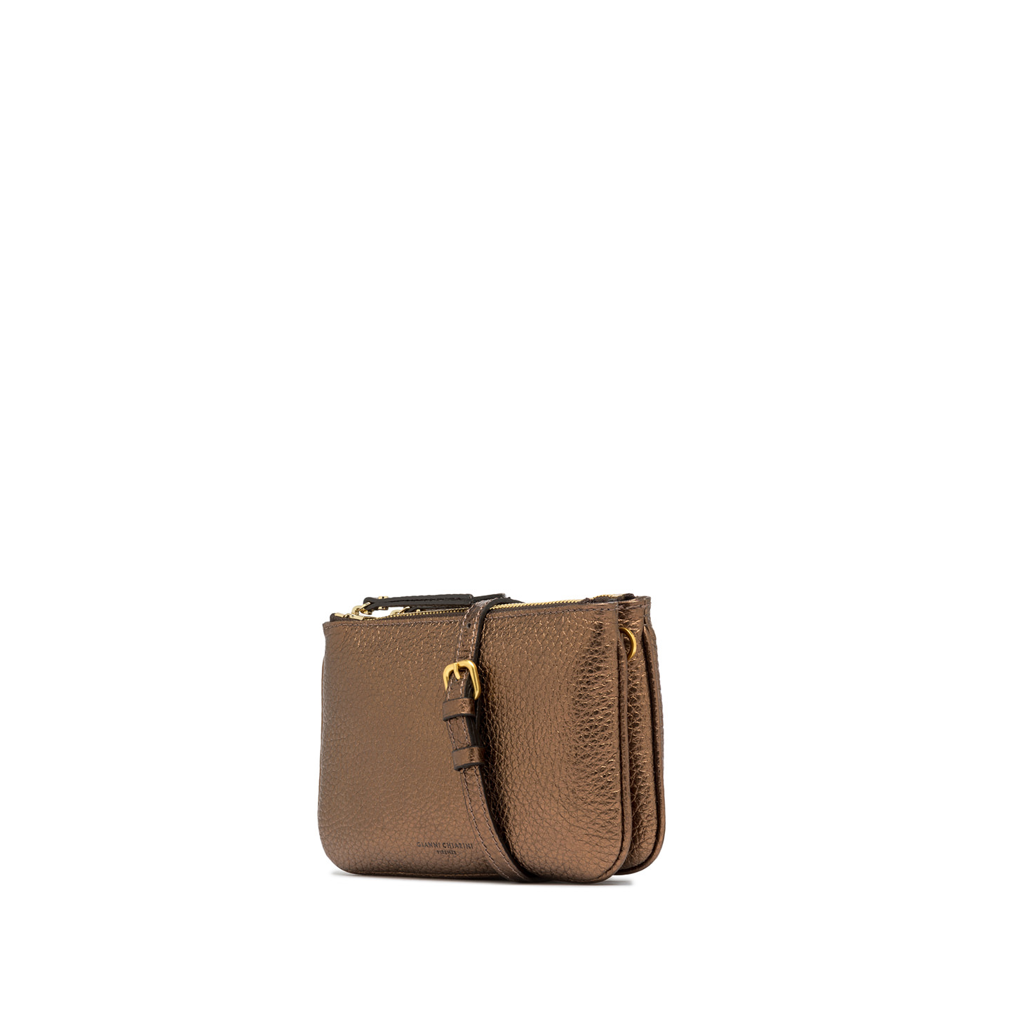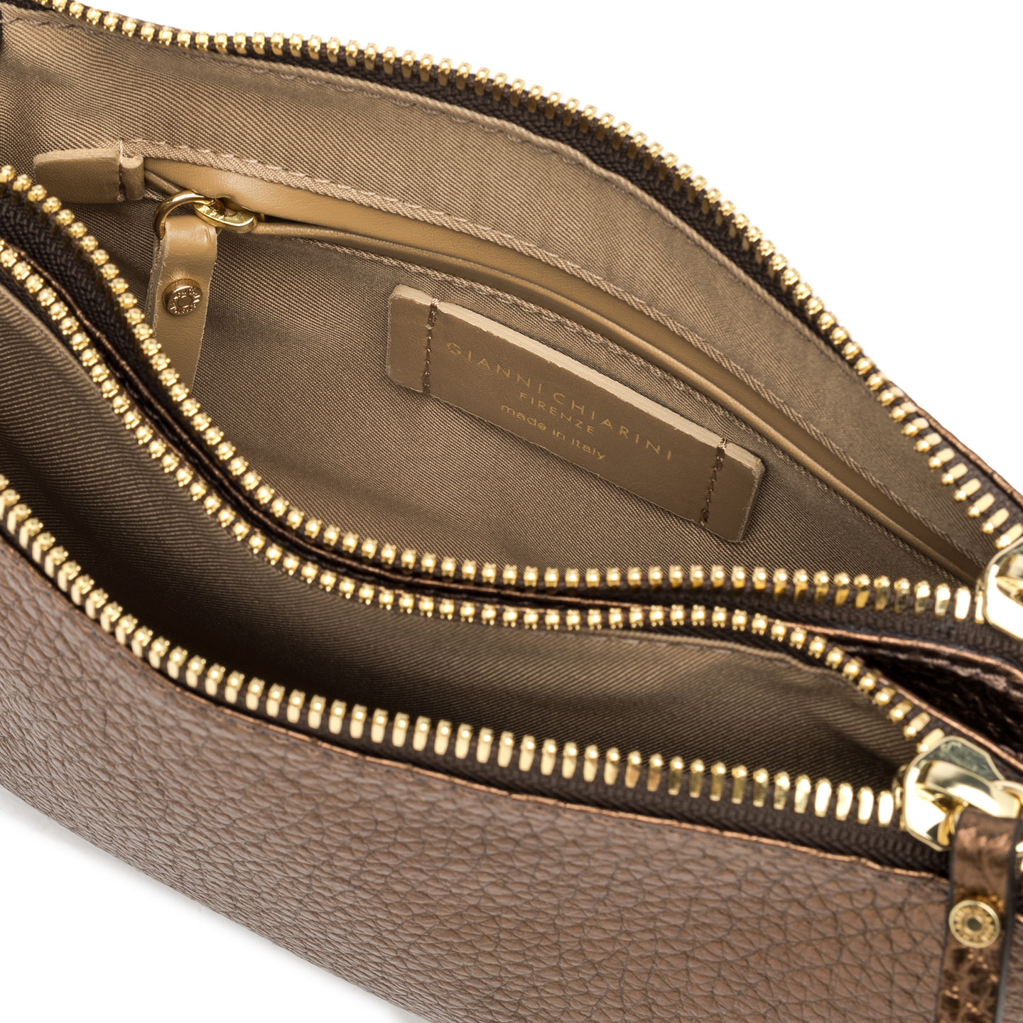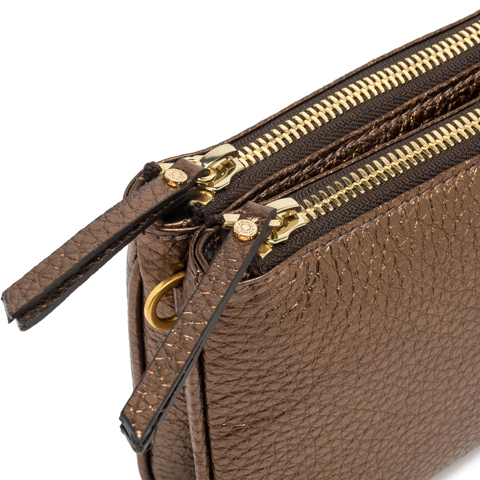 L'estetica pulita e contemporanea della borsa a tracolla Frida la rende un accessorio disinvolto e pratico. Realizzata in pelle grana maxi è impreziosita da due zip che ricreano due ampi scomparti. Dotata di una sottile tracolla in pelle regolabile e removibile in tono. Dimensioni: 24x16x5 cm.