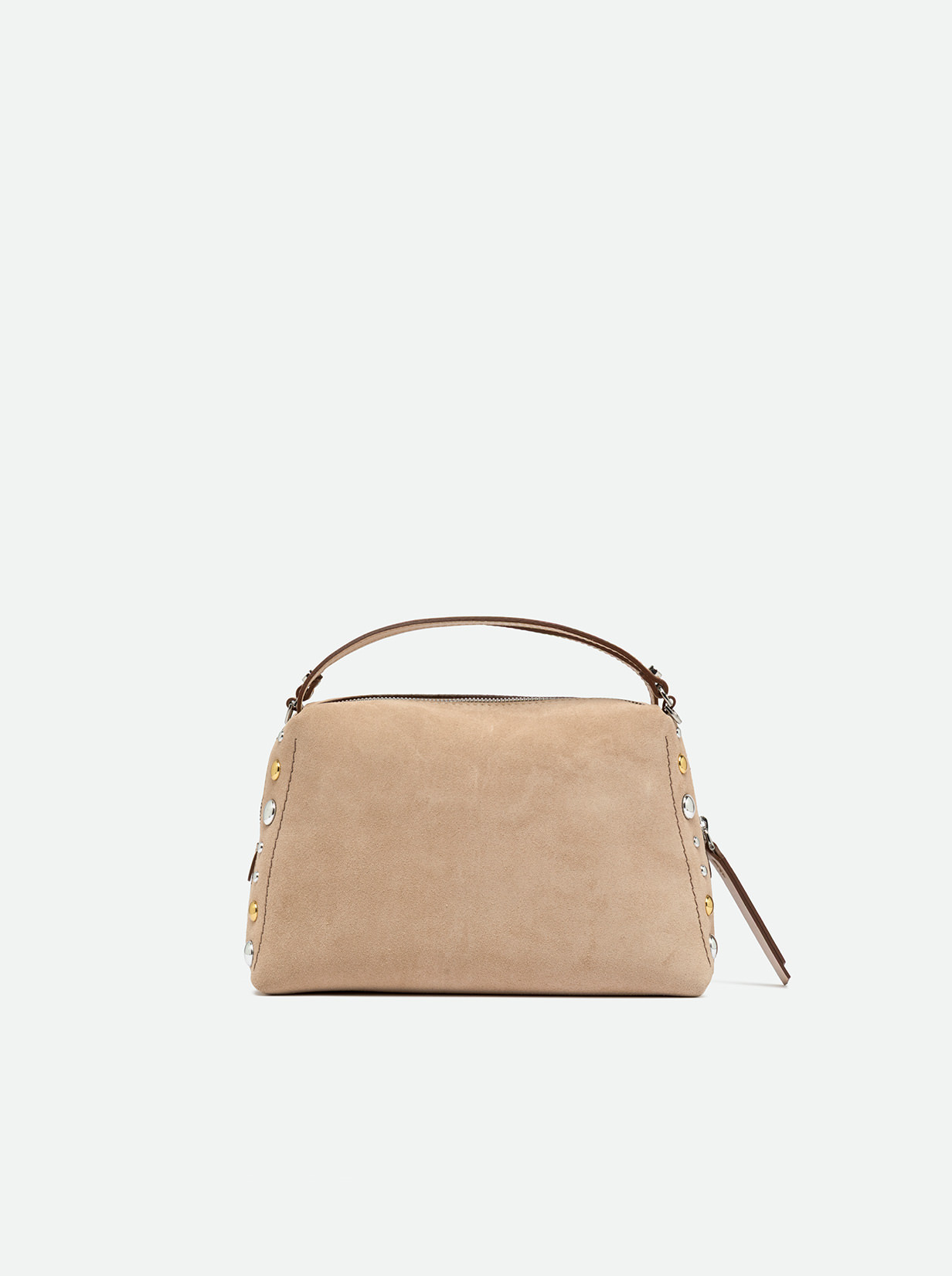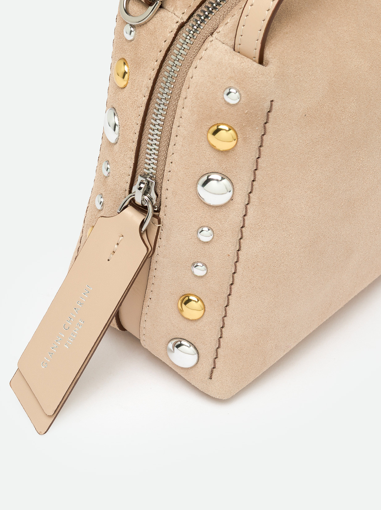 Compatta, leggera e spaziosa, la borsa Alifa è l'accessorio perfetto per chi cerca un tocco country senza rinunciare alla praticità. Realizzata in pelle scamosciata, si distingue per il gioco di contrasti creato dalle impunture a vista e dalle borchie, che le conferiscono un'anima decisamente country. Dotata di doppi manici per portarla a mano e di una sottile tracolla in tono, offre anche la possibilità di indossarla a spalla o crossbody, adattandosi a ogni occasione. Dimensioni: 26x16x12 cm.
