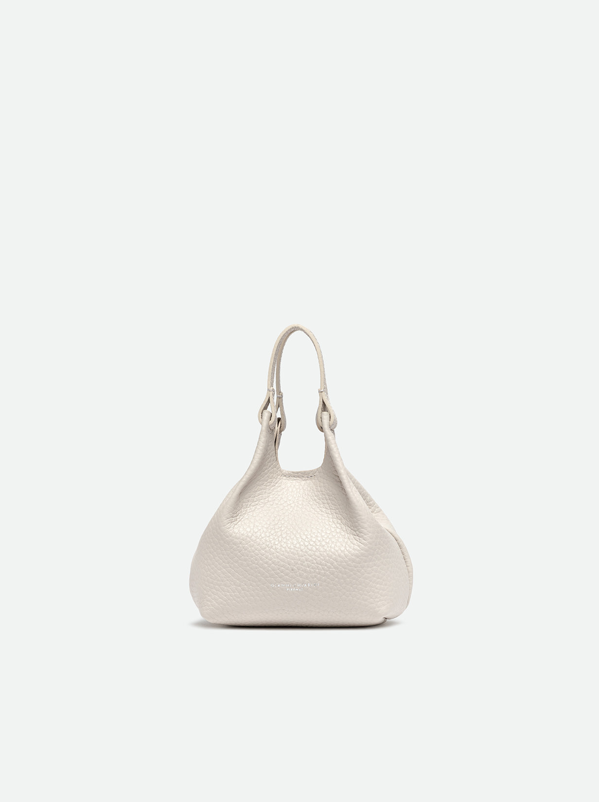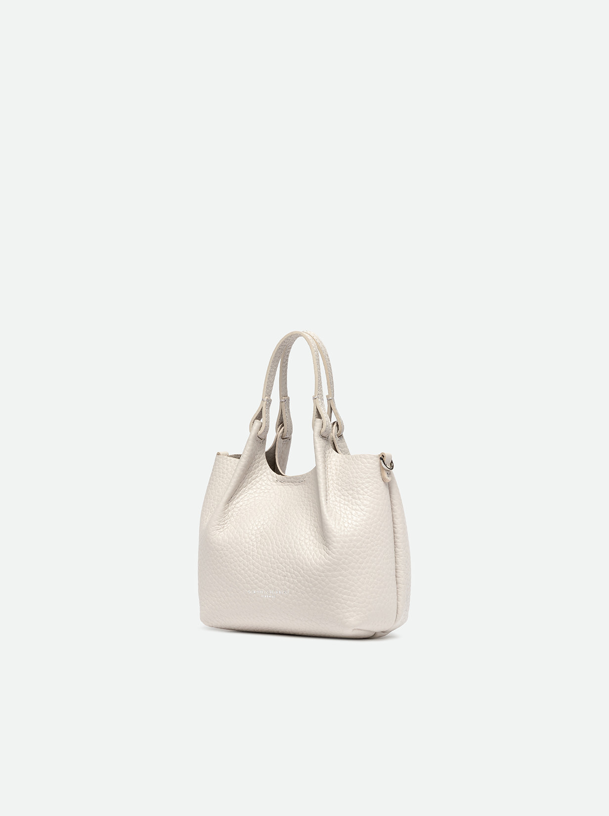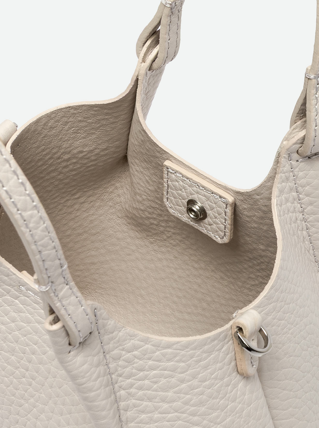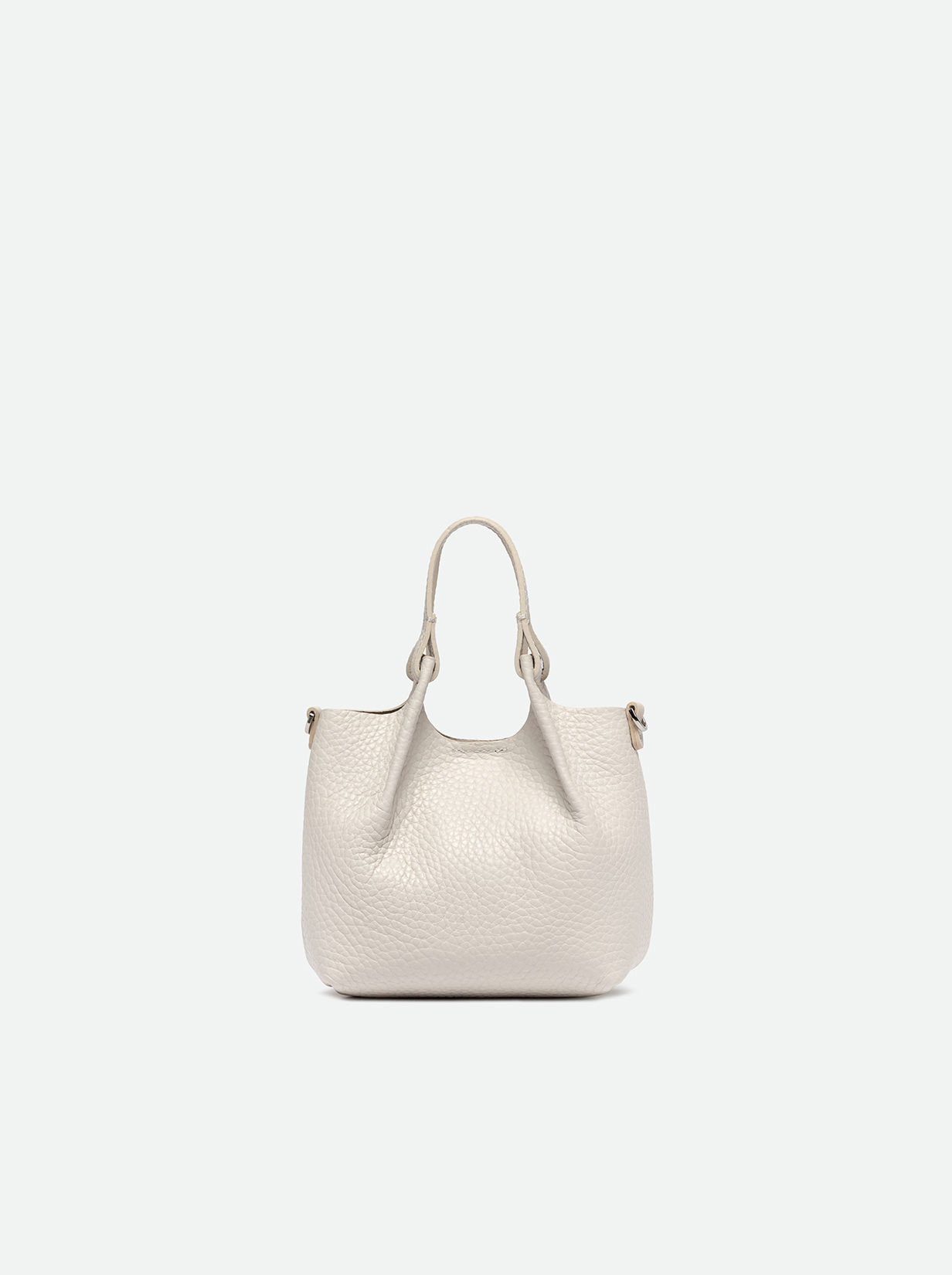 L'icona del brand, la borsa DUA, è realizzata in pelle dalla grana maxi, caratterizzata da una texture unica e distintiva. Dotata di un monoscomparto sfoderato, presenta profili superiori in pelle martellata e doppi manici in tono. Pratica ed essenziale, è perfetta per completare ogni look con stile. Può essere portata a mano o a spalla. Dimensioni: 19x20x8 cm.