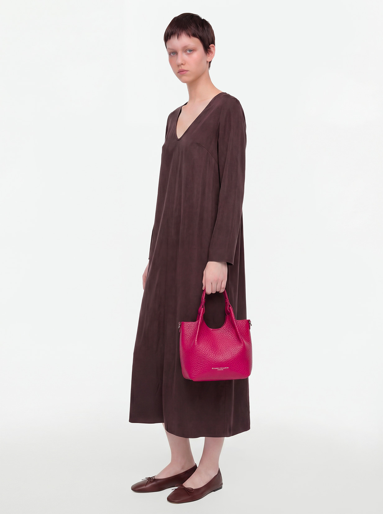 L'icona del brand, la borsa DUA, è realizzata in pelle bubble double, caratterizzata da una texture unica. Dotata di un monoscomparto sfoderato, presenta profili superiori in pelle martellata e doppi manici in tono. Pratica ed essenziale, è perfetta per completare ogni look con stile. Può essere portata a mano o a spalla. Dimensioni: 19x20x8 cm.