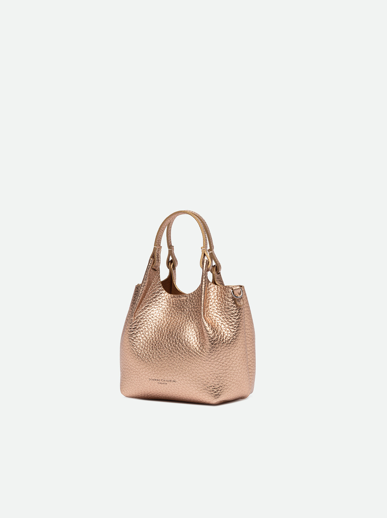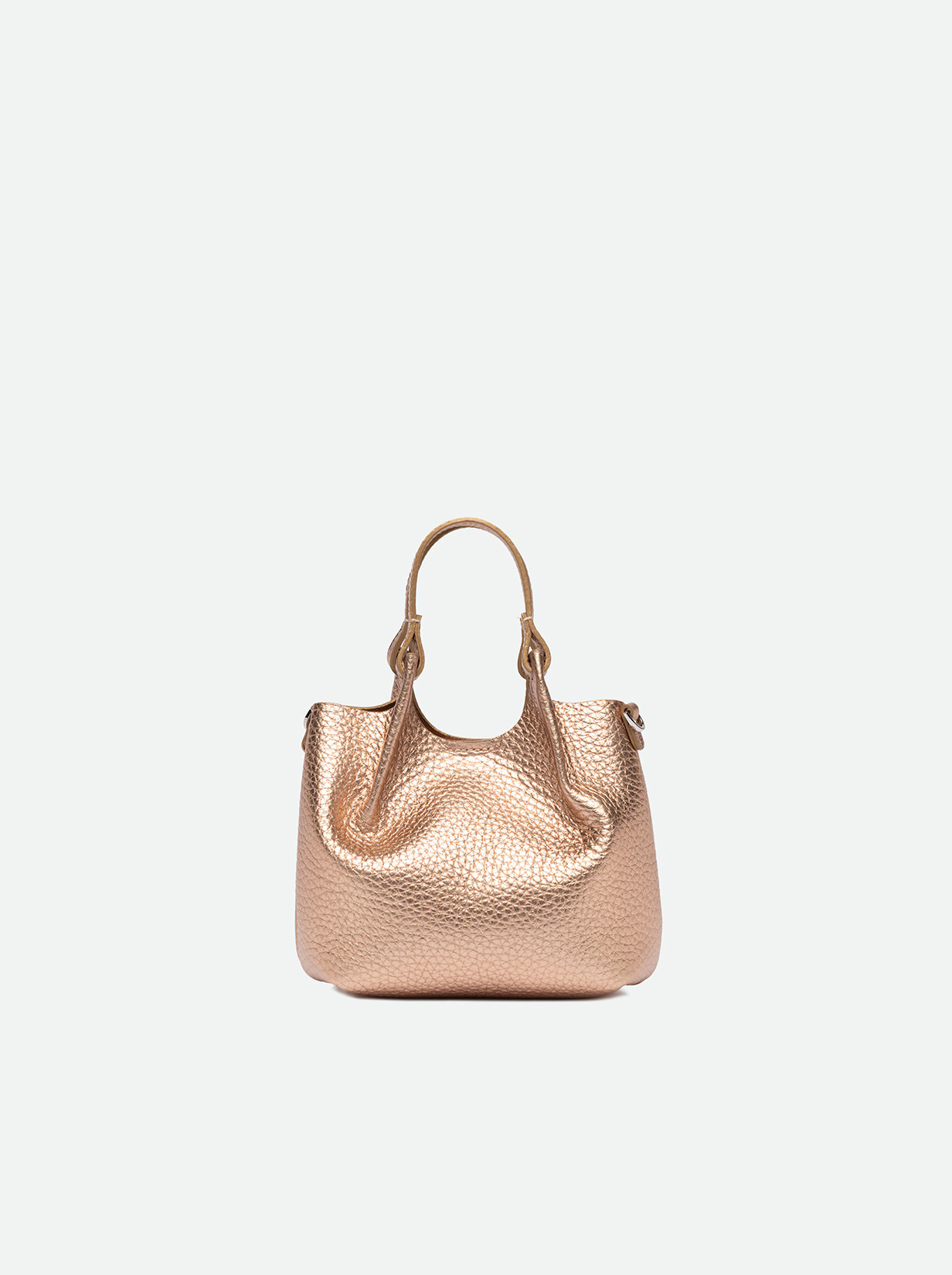 L'icona del brand, la borsa DUA, è realizzata in pelle bubble double, caratterizzata da una texture unica. Dotata di un monoscomparto sfoderato, presenta profili superiori in pelle martellata e doppi manici in tono. Pratica ed essenziale, è perfetta per completare ogni look con stile. Può essere portata a mano o a spalla. Dimensioni: 19x20x8 cm.