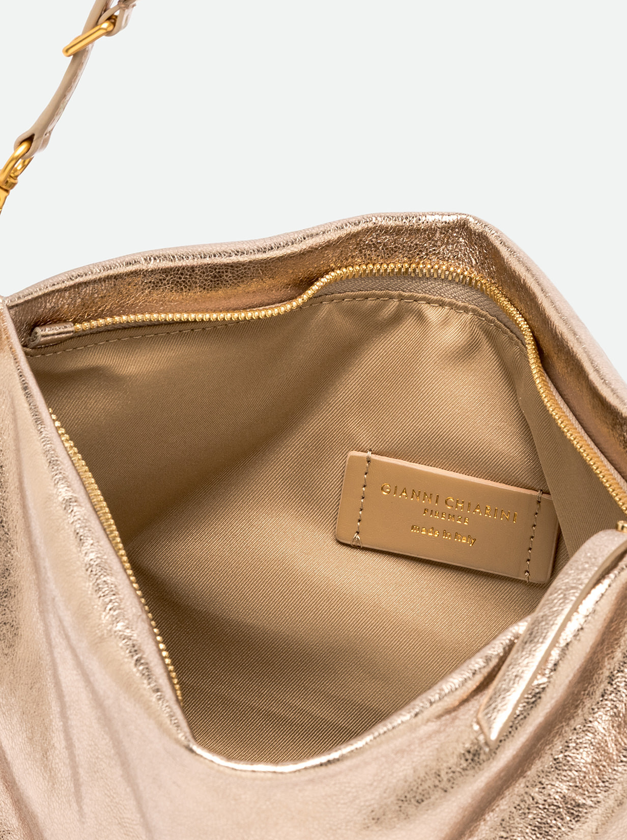 Fanny by Gianni Chiarini Firenze è una borsa dalla morbida silhouette allungata, innegabilmente femminile e contemporanea, perfetta anche per la sera. Realizzata in suede arricchito da una lamina metallizzata, presenta una chiusura superiore con zip. La doppia portabilità permette di indossarla a spalla grazie all'intreccio con catena dorata o crossbody con la tracolla in pelle. I dettagli dei nodi e i componenti in metallo aggiungono un tocco di grinta e luminosità, rendendola adatta a ogni occasione. Dimensioni: 35,5x21x9 cm.