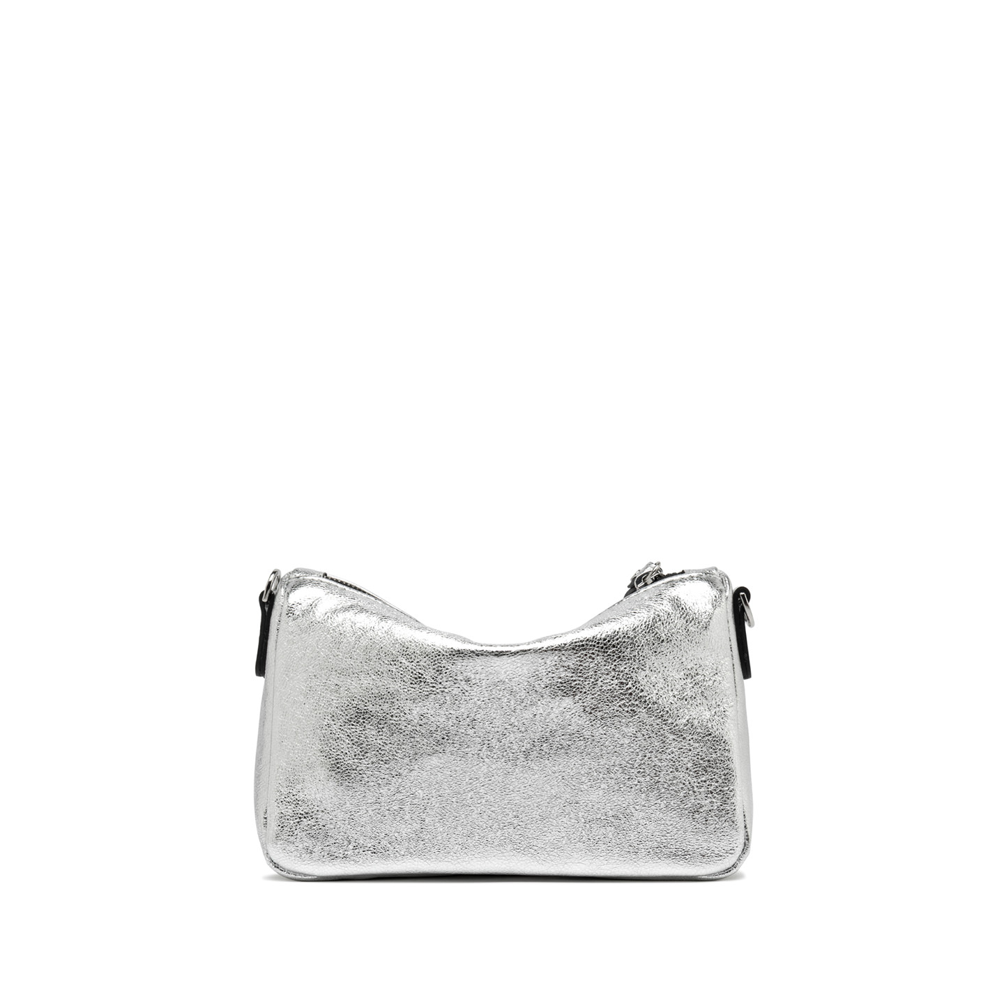 La borsa Nora Pouch by Gianni Chiarini Firenze è realizzata in suede arricchito da una lamina metallizzata. È dotata di un cinturino in pelle che permette di portarla al polso e di una tracolla regolabile, entrambi removibili. Presenta una chiusura con zip per una maggiore praticità. Dimensioni: 20,5x14,5x8 cm.