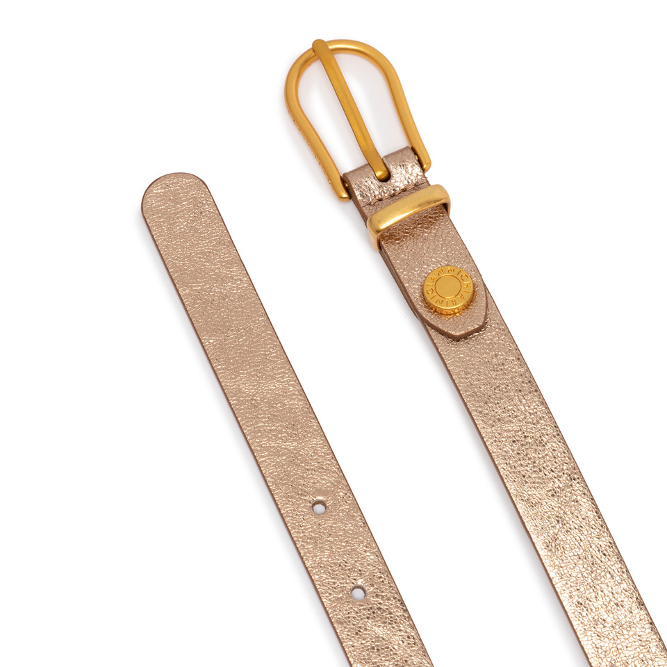Cintura dalle linee semplici ed essenziali, ideale per valorizzare sia look casual che eleganti. Realizzata in pregiata pelle metallizzata, è arricchita da una fibbia logata in metallo.