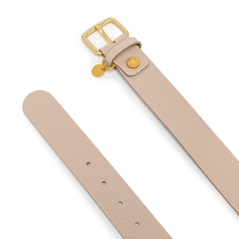 Cintura piatta dalle linee essenziali e sofisticate, ideale per completare look sia casual che eleganti. Realizzata in pelle a grana maxi, è impreziosita da una fibbia logata con un delicato pendente logato decorativo.