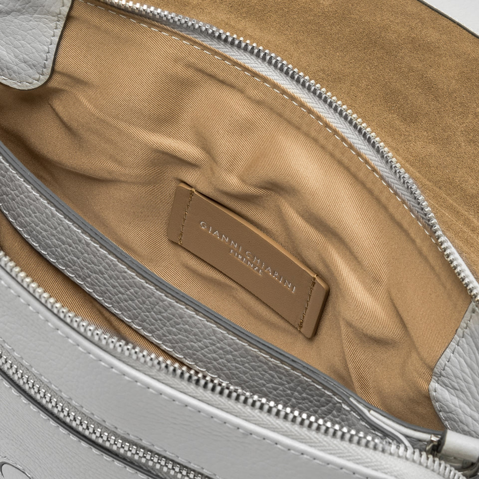 Da portare a mano o con la sottile tracolla in pelle, la borsa Three by Gianni Chiarini Firenze è realizzata in pregiata pelle martellata. Giovane e divertente, presenta un design innovativo che si distingue per le zip a contrasto nella parte superiore. Perfetta per outfit casual, ma anche per serate eleganti. Dimensioni: 25x22x5 cm.